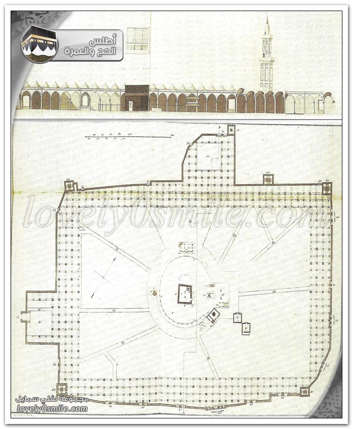 في الأعلى مرتسم محفور على النحاس للقسم الغربي من المسجد الحرام سنة 1814م, قام بعملها الأسباني باديا ليبليخ, دومينجو.