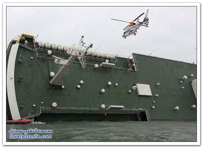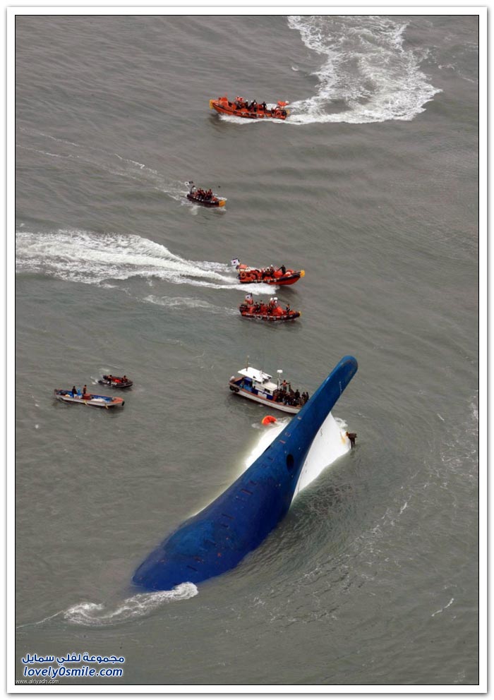 - وبينت الصور التي نقلتها محطات التلفزة أن السفينة مالت حوالي 45 درجة، كما أن المياه غمرتها بالكامل ولم يبق سوى جزء بسيط من مؤخرها عائماً فوق المياه.