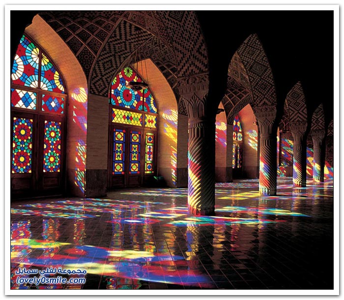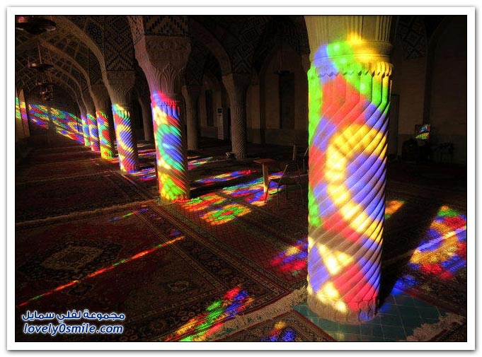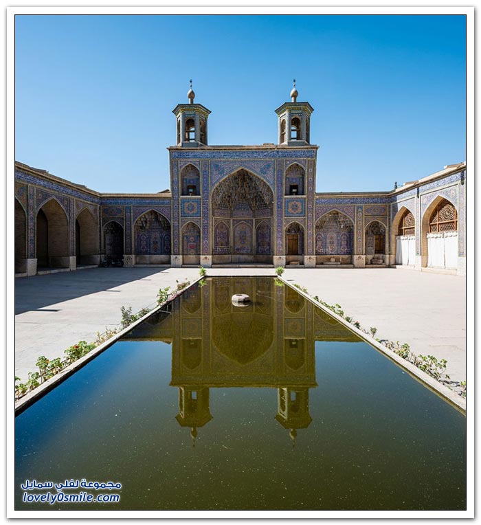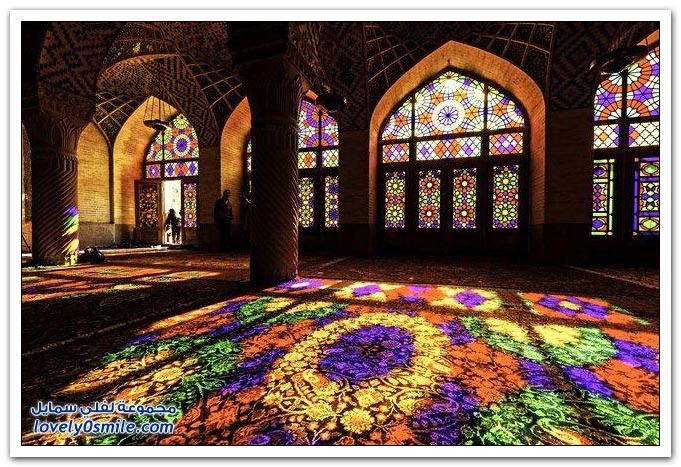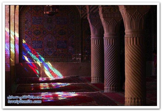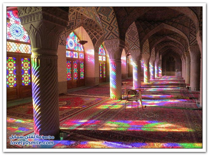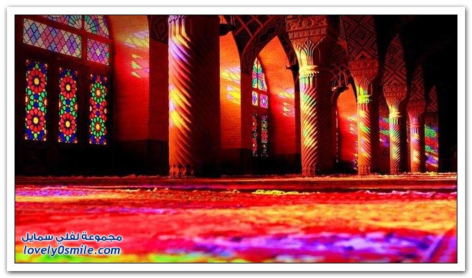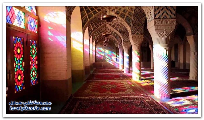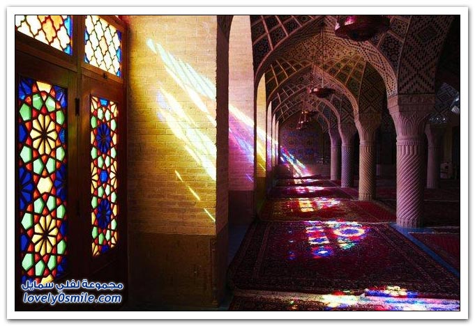 - وذكر الموقع أن المسجد تم بناؤه بين عامي 1876 و1888 بأمر من حاكم مقاطعة كاجار وقتها الميرزا حسن علي ناصر الملك، مضيفة أن الزجاج الملون يبدو أنه يأسر ضوء الصباح بداخل المسجد مكوناً مزيجا هائلا من الإبهار بين الضوء الداخل المتأثر بفعل الزجاج وبين الأرضيات والأسطح والحوائط المليئة بالتعرجات والقباب ومزيج من فنون العمارة الإسلامية والملونة أصلاً بمزيج يبدو بمنافسة مع الضوء الملون سلفًا.