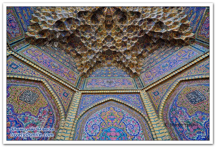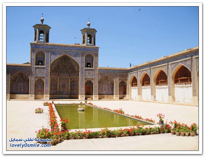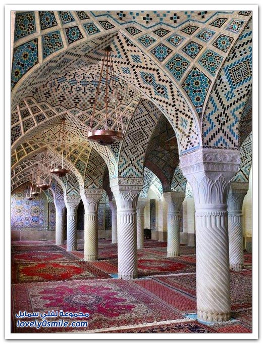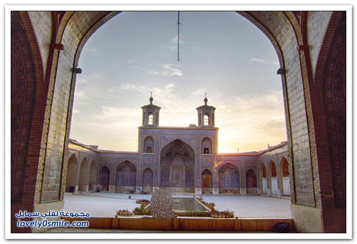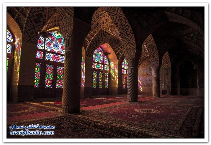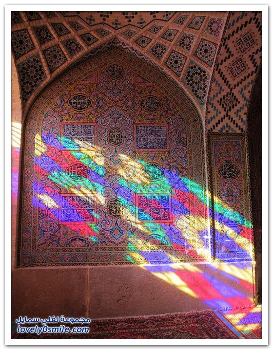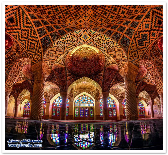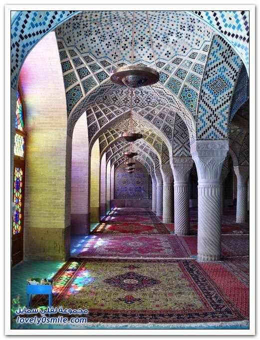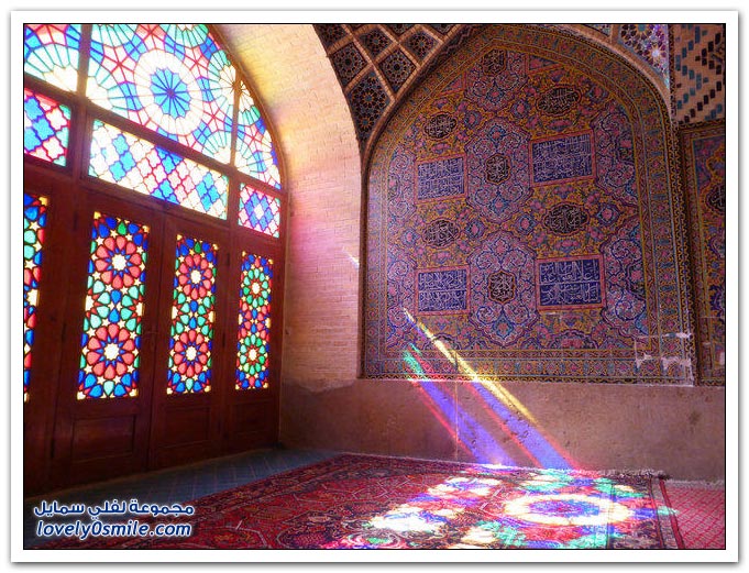 - وذكر الموقع أن المسجد تم بناؤه بين عامي 1876 و1888 بأمر من حاكم مقاطعة كاجار وقتها الميرزا حسن علي ناصر الملك، مضيفة أن الزجاج الملون يبدو أنه يأسر ضوء الصباح بداخل المسجد مكوناً مزيجا هائلا من الإبهار بين الضوء الداخل المتأثر بفعل الزجاج وبين الأرضيات والأسطح والحوائط المليئة بالتعرجات والقباب ومزيج من فنون العمارة الإسلامية والملونة أصلاً بمزيج يبدو بمنافسة مع الضوء الملون سلفًا.