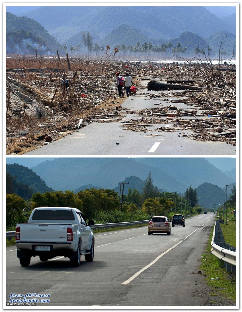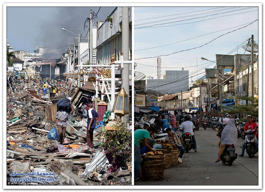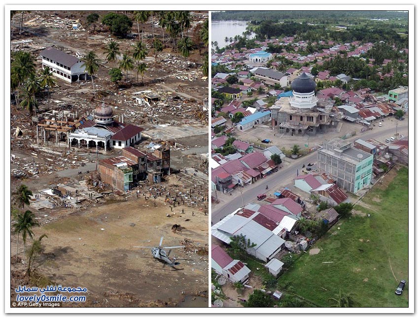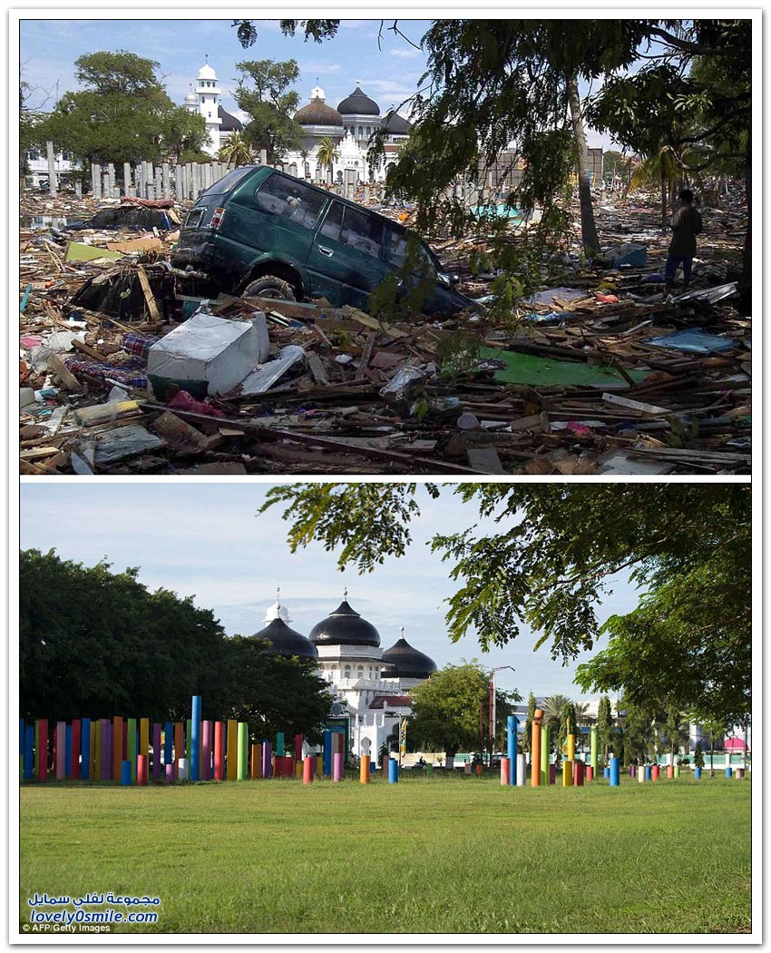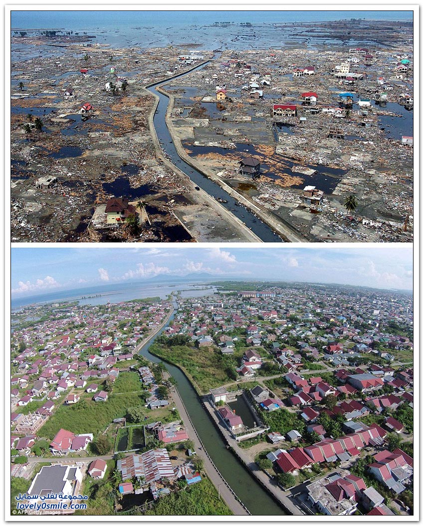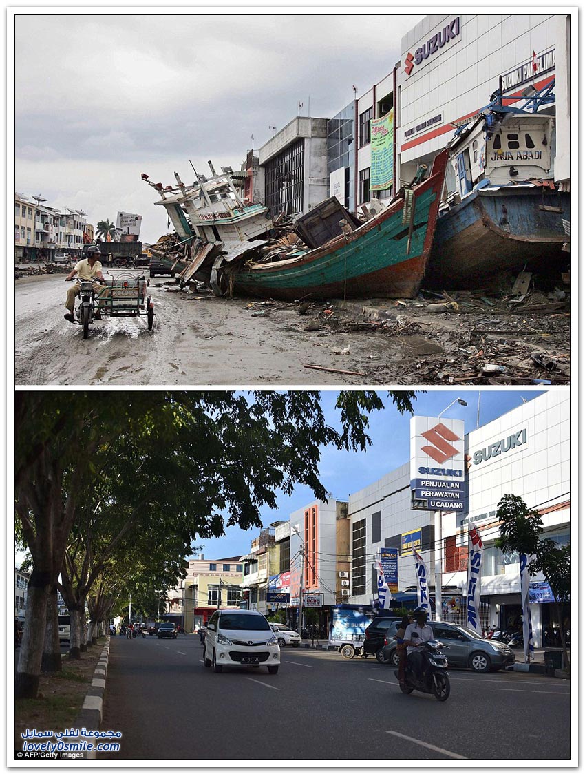 - بعد جهود 10 سنوات رجعت المدينة إلى عهدها السابق كما تظهر لنا هذه الصور التي التقطت بعضها بعد أسبوع من كارثة تسونامي وبعضها الآخر لنفس الأماكن في الأول من ديسمبر عام 2014.