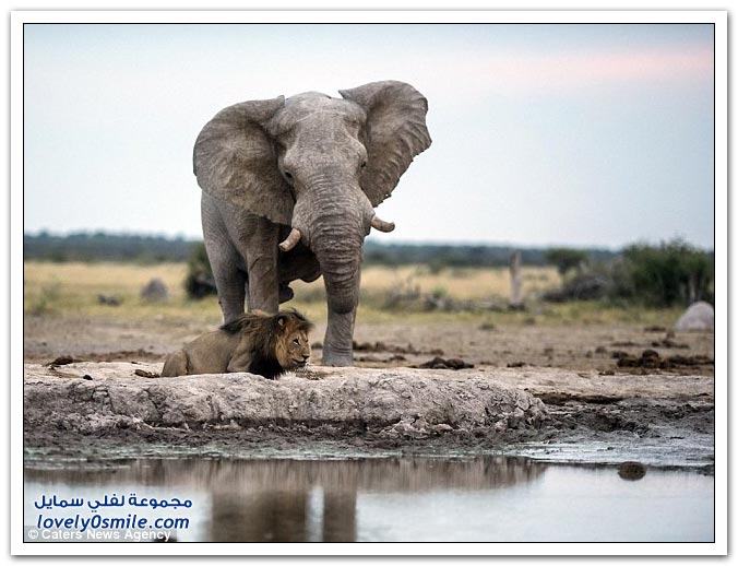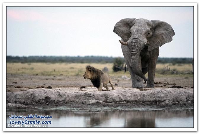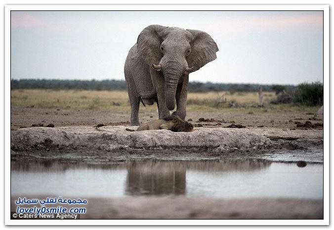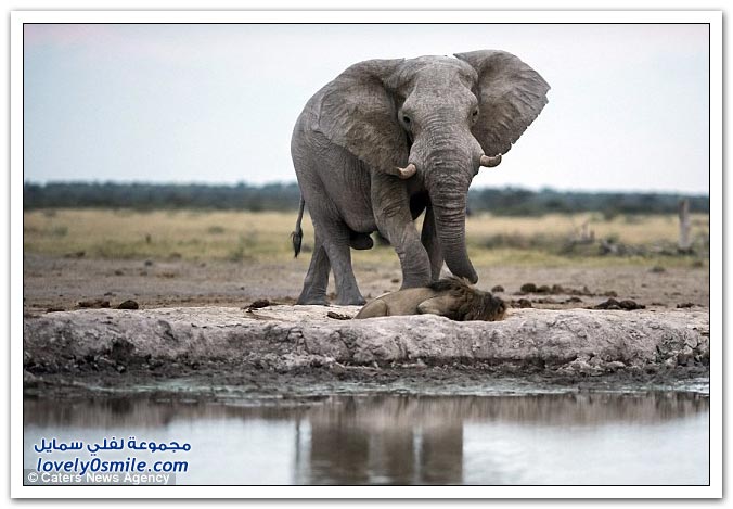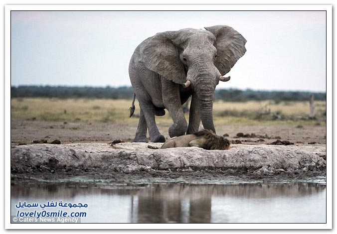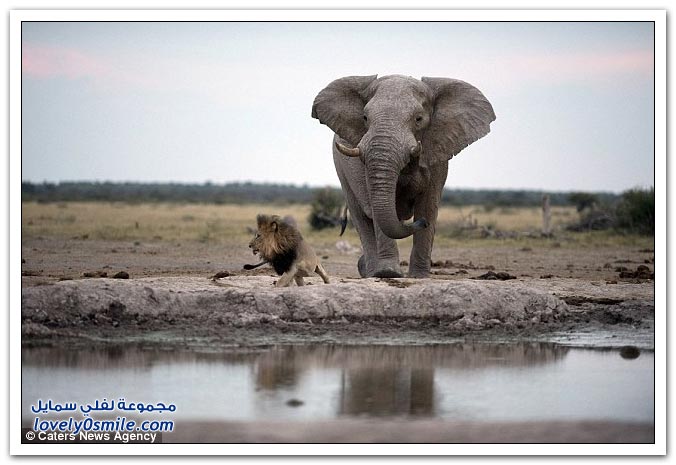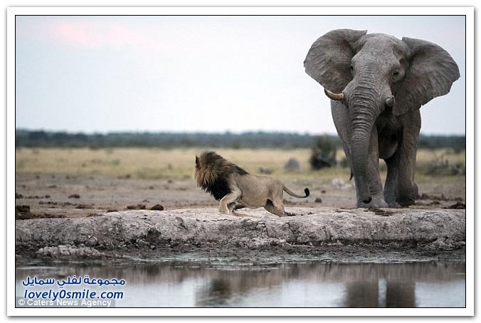 فيل يُفاجئ أسد ويُحاول الهجوم عليه
