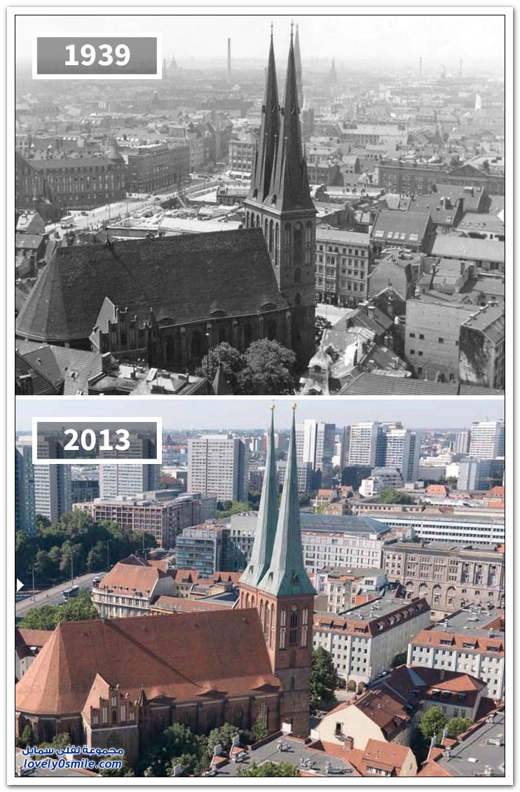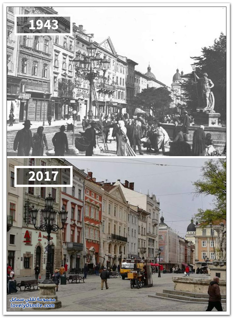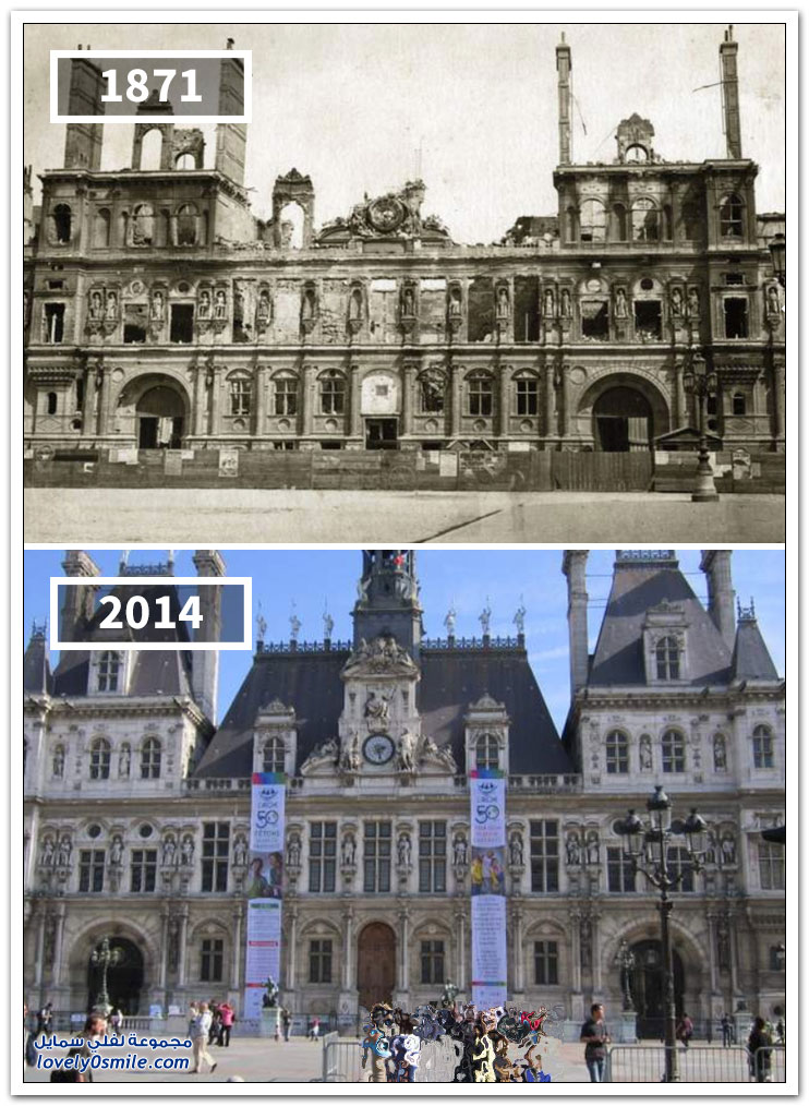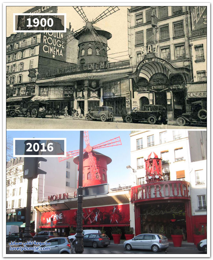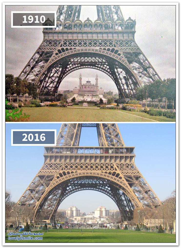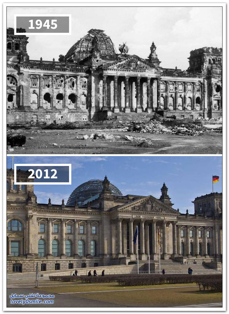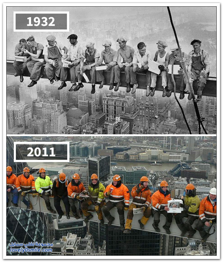 الجزء العلوي من الصورة لناطحة سحاب في نيويورك عام 1932، الولايات المتحدة الأمريكية، والجزء السفلي من الصورة لعام 2011 في لندن