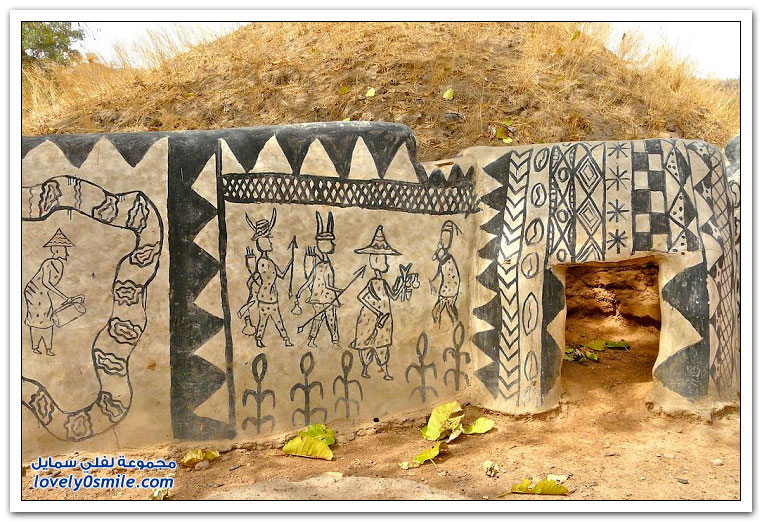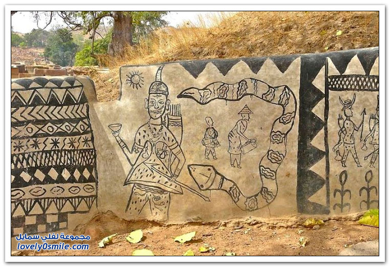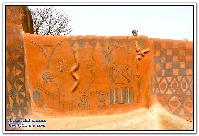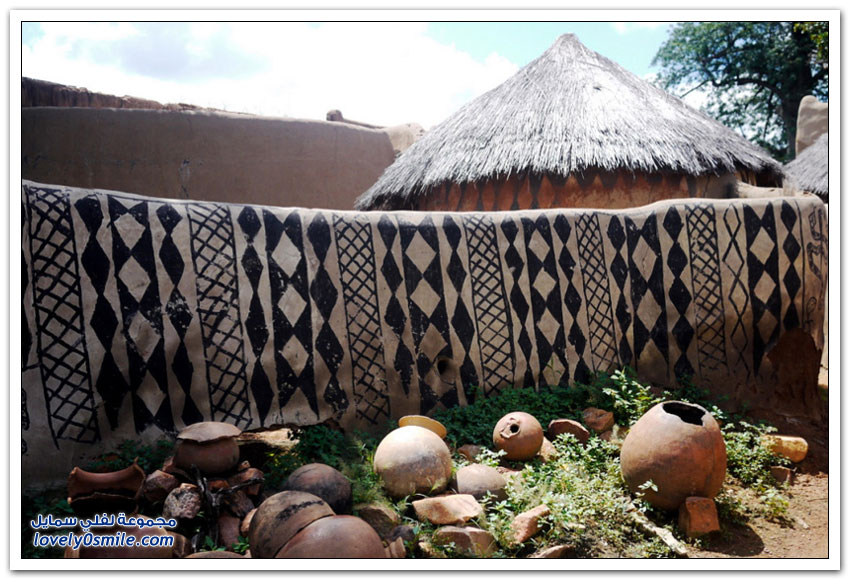 - وتحرص نساء القرية على تشكيل جداريات جميلة ونقوش مختلفة على المنازل عبر استعمال الطين الملون والطباشير الأبيض، ثم يتم تغليف الجدران بمادة الورنيش الطبيعية المصنوعة من مغلي شجرة الفاصولياء الأفريقية لحماية المنزل من العوامل الطبيعية وتقلبات الطقس.