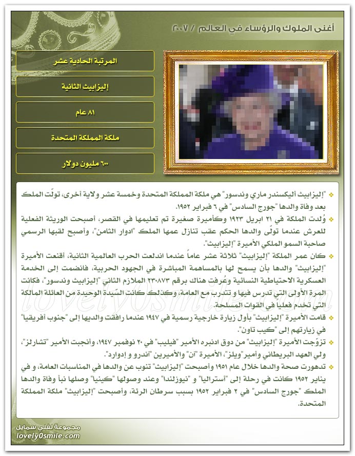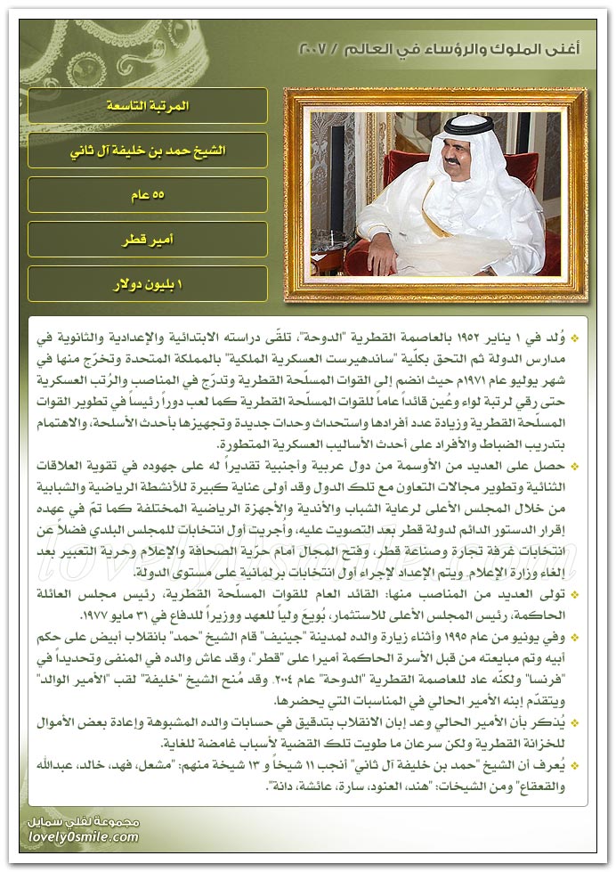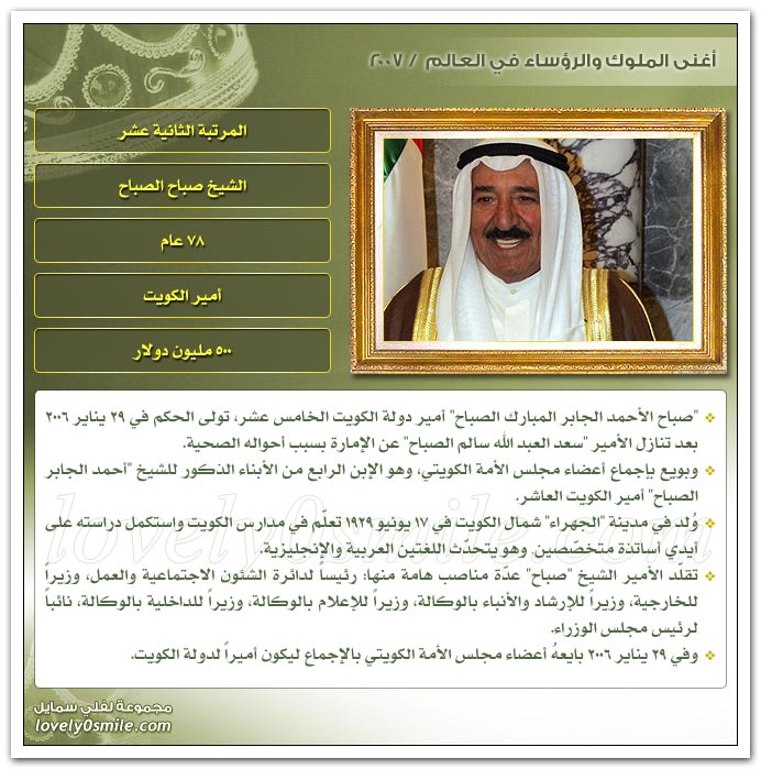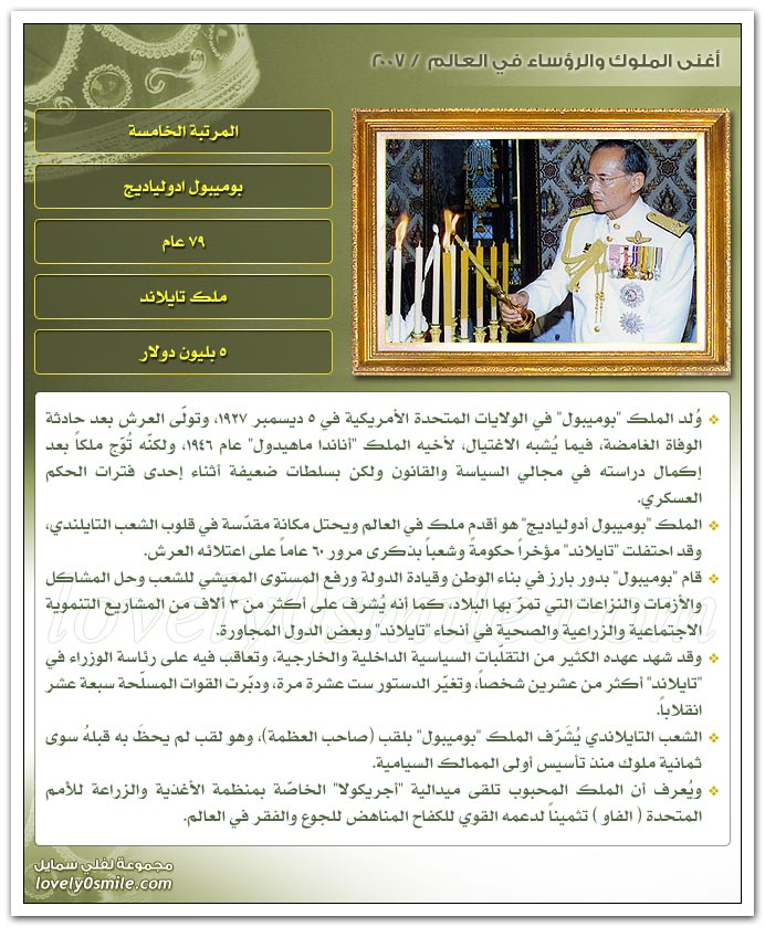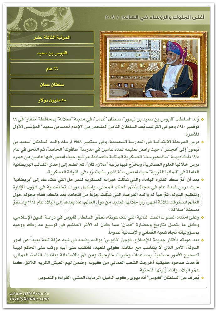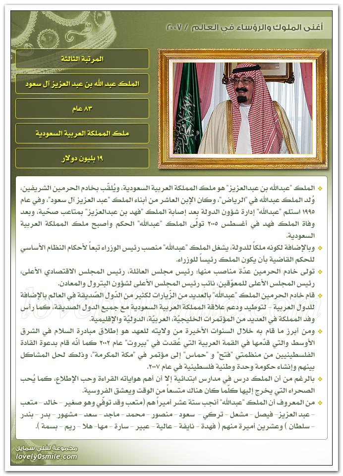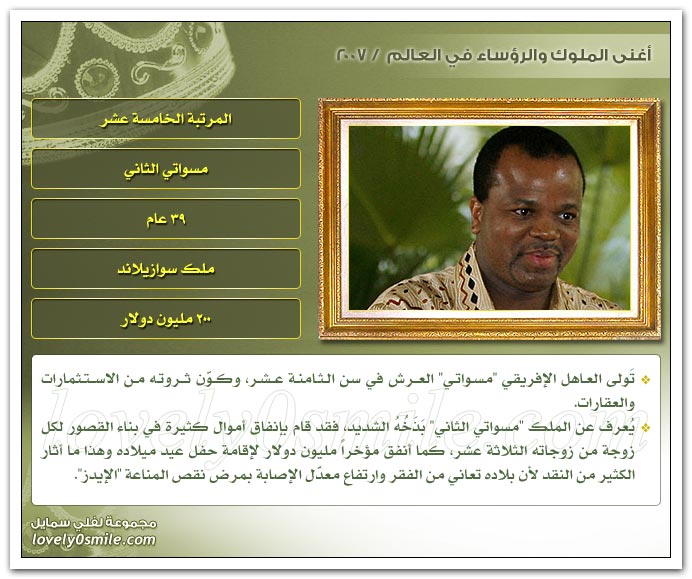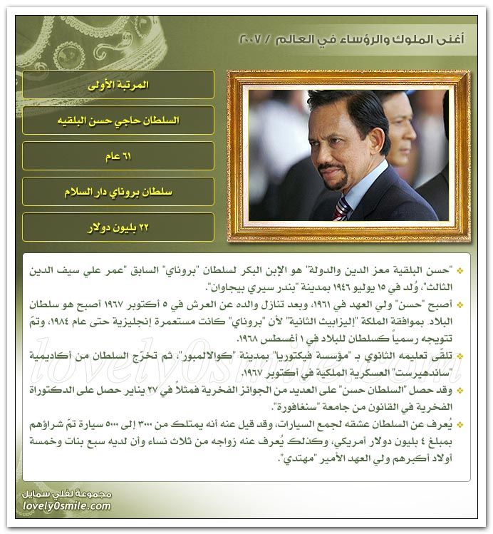 * الملوك هم بشر مثلنا تم اختيارهم ليحكومونا ، منهم من يصلح فعلاً للحكم ومنهم من لا يصلح ولكن ما أتفق فيه الملوك في هذا التقرير أنهم يملكون ثروات كبيرة ، فهؤلاء أغني الملوك والرؤساء في العالم.