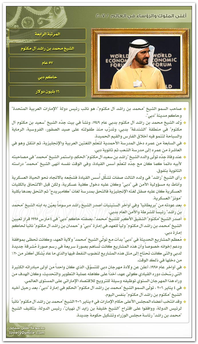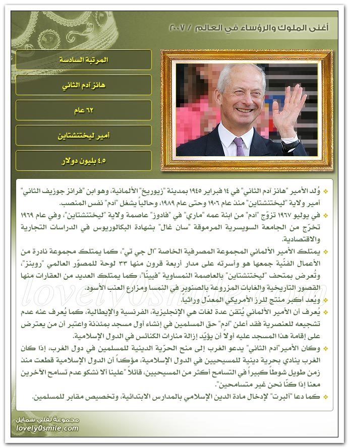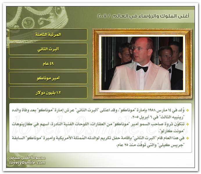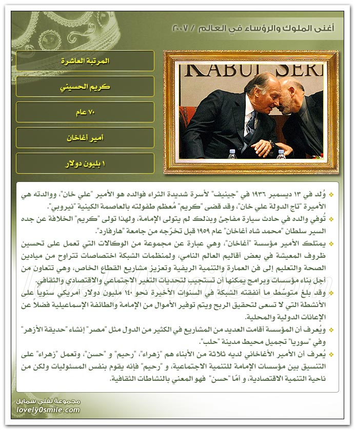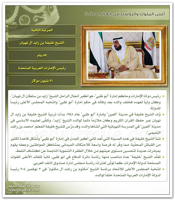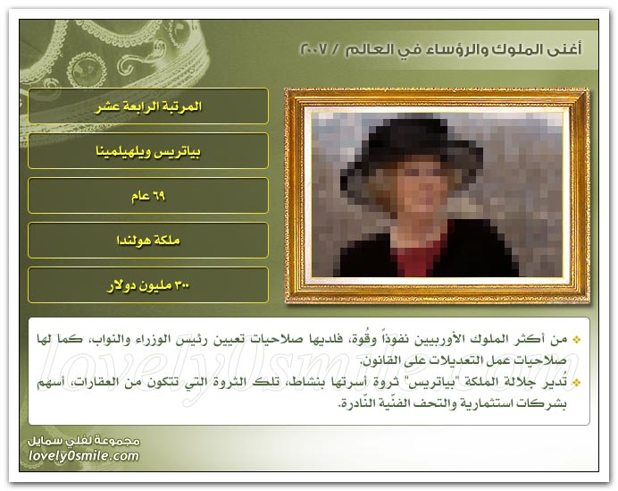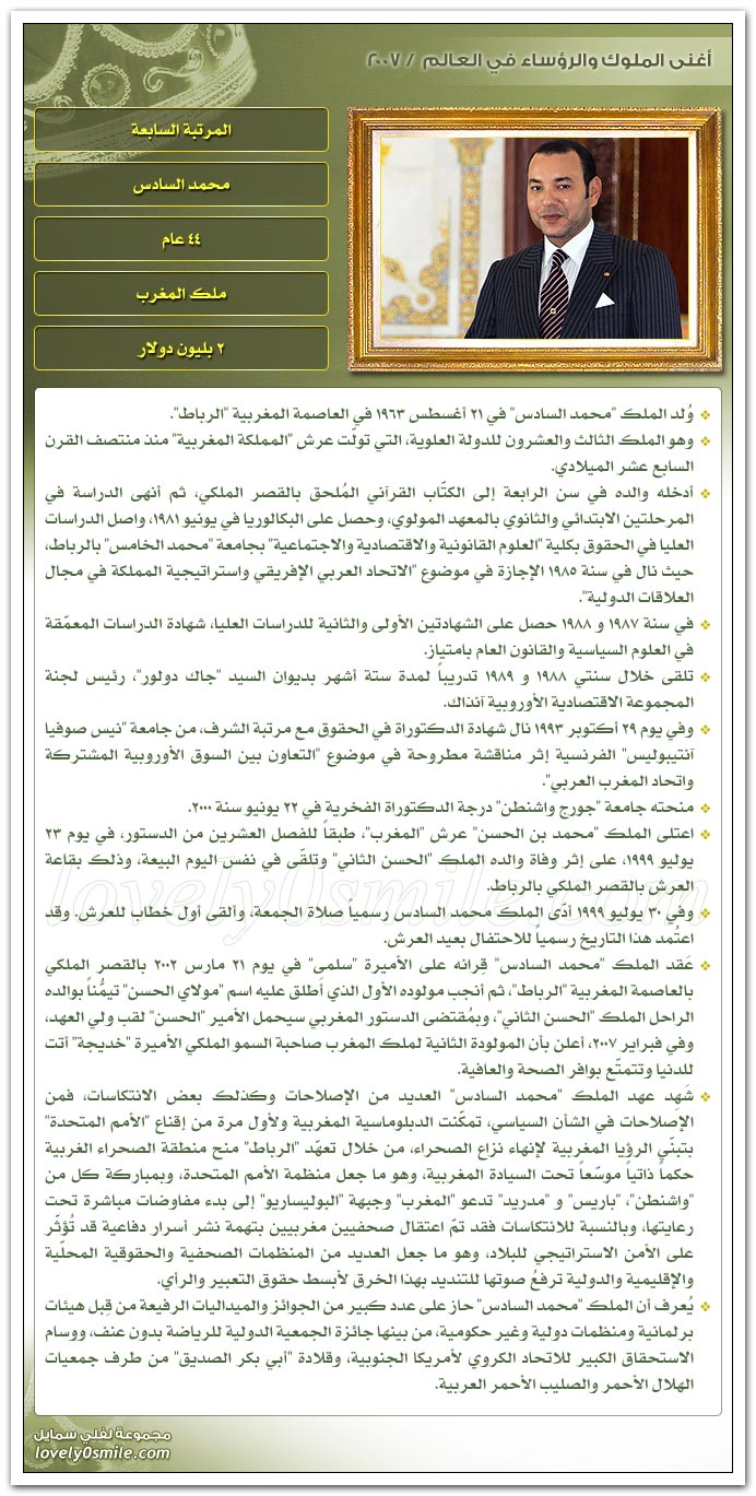 * الملوك هم بشر مثلنا تم اختيارهم ليحكومونا ، منهم من يصلح فعلاً للحكم ومنهم من لا يصلح ولكن ما أتفق فيه الملوك في هذا التقرير أنهم يملكون ثروات كبيرة ، فهؤلاء أغني الملوك والرؤساء في العالم.