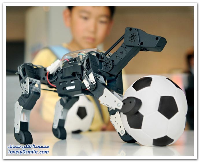 صبي ياباني يتحكم لاسلكيا في روبوت على هيئة كلب يمكنه ركل الكرات.
