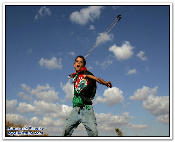 صبي فلسطيني يرجم جنود الاحتلال احتجاجا علي إنشاء الجدار العازل.