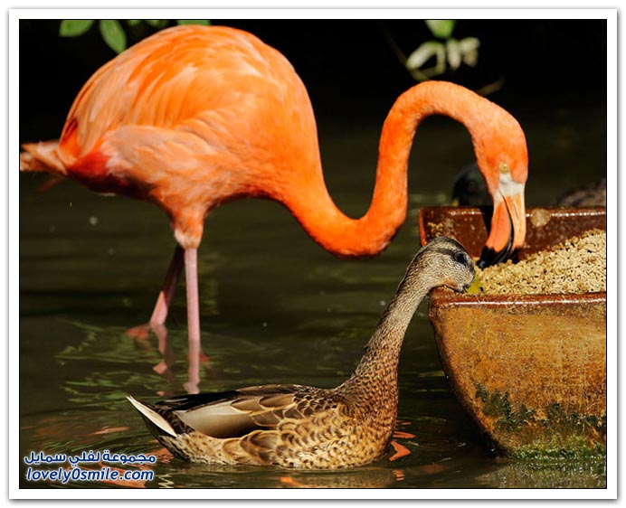 بطة وطائر فلامنجو يأكلان من نفس الوعاء جنوبي ألمانيا.