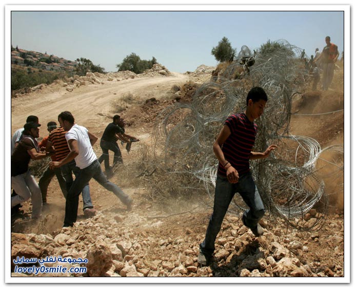فلسطينيون يزيلون الأسلاك الشائكة حول الجدار العازل قرب رام الله.