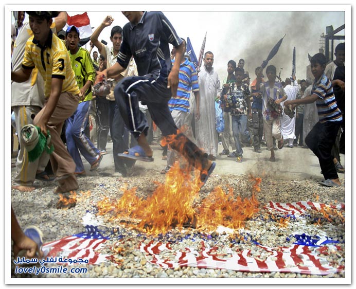 عراقيون يحرقون العلم الأمريكي بعد صلاة الجمعة في بغداد.