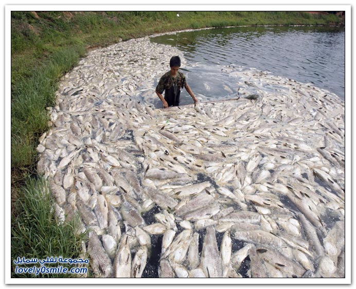 فلاح صيني يجمع سمكا مسموما من بحيرة يوان الصينية.