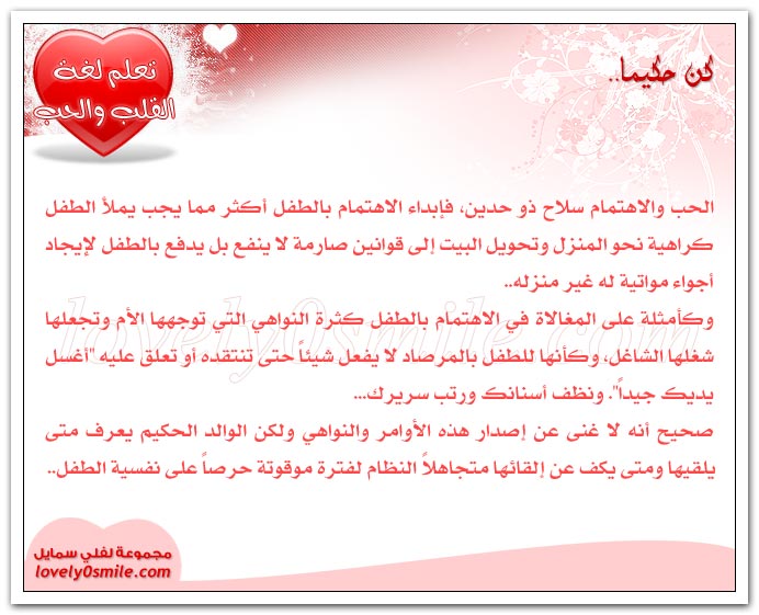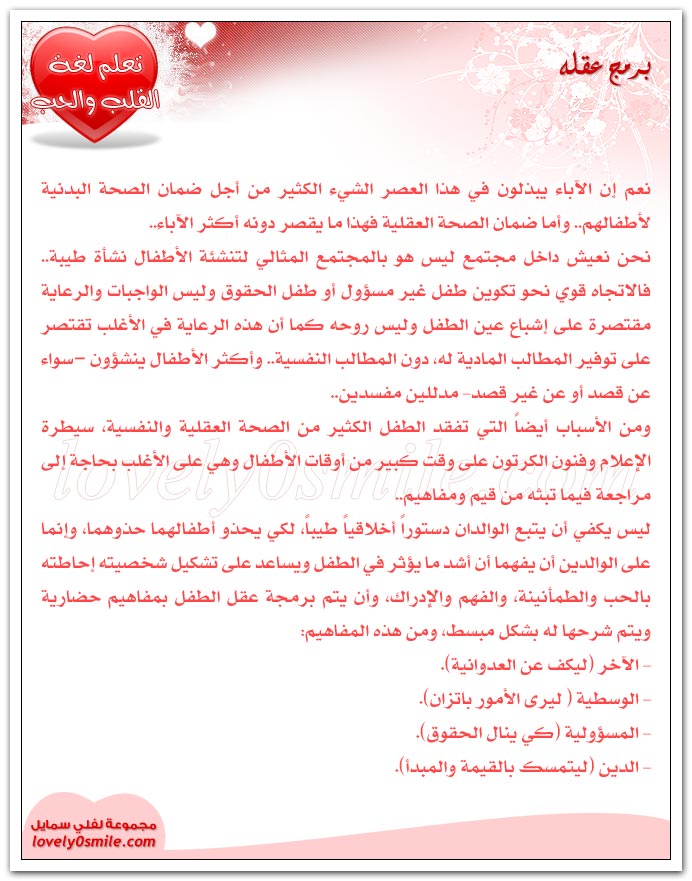 فعلا كلمات رائعة حقا تكتب بمداد من ذهب وياحبذا لو إجتمع الأبوان وطبقا هذه المبادئ لأخرجوا جيلا مؤمنا