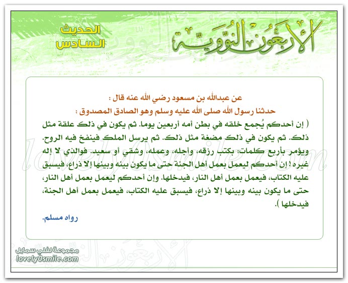 - هذا الحديث السادس من الأحاديث النووية وفيه بيان تطور خلق الإنسان في بطن أمه وكتابه وأجله ورزقه وغير ذلك.