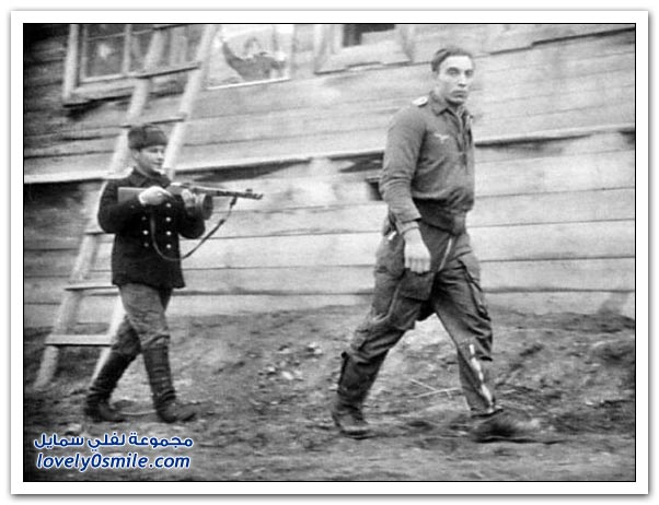 الحرب العالمية الثانية: ما يبدو انه روسي يقود ضابطا ألمانيا أسيرا، العلامات الفارقة: