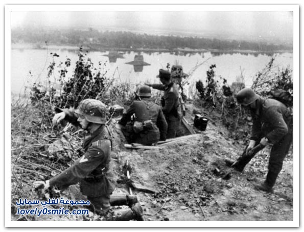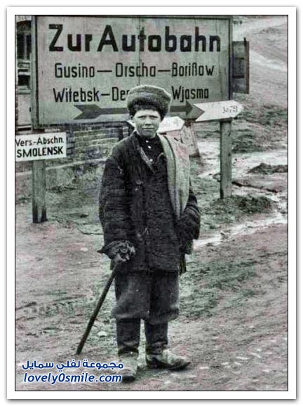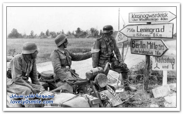 الجانب الآخر من الحرب الإعلامية، جنود ألمان جوار شواخص طريق باتجاه برلين (العاصمة الألمانية ) 1595 كم ، باتجاه لينينجراد 75 كم !! فحوى الصورة: نحن في عقر دارهم.