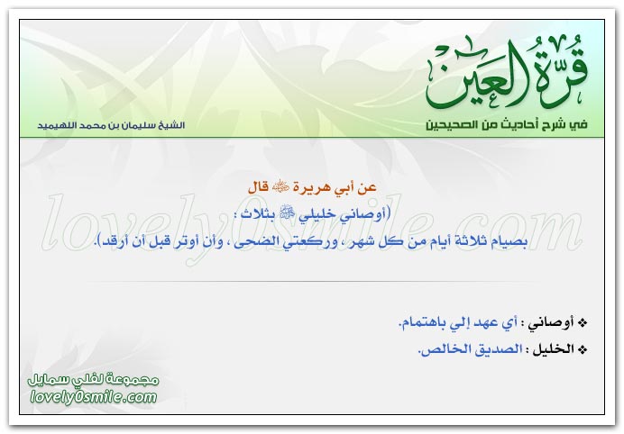- عن عبد الله بن عمر رضي الله عنه قال: قال رسول الله صلى الله عليه وسلم: ( صوم ثلاثة أيام من كل شهر صوم الدهر كله ) متفق عليه.