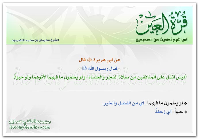 - وإنما كانت العشاء والفجر أثقل عليهما من غيرهما لقوة الداعي إلى تركهما ، لأن العشاء وقت السكون والراحة ، والصبح وقت لذة النوم.