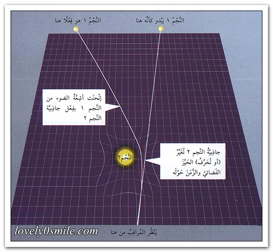 - ترتئي النظرية النسبية أيضاً أن الجاذبية الفائقة القوة، كتلك المتواجدة على مقربة من أحد النجوم، يمكنها (حَنيُ) الحيز الفضائي، بحيث تتقوس الخطوط المستقيمة – فلا شيء ثابت في الكون سوى سرعة الضوء التي تبلغ 300000 كيلومتر في الثانية.