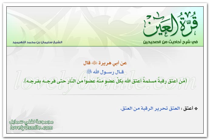 - وقال صلى الله عليه وسلم: ( أيما امرىء مسلم أعتق امرءاً مسلماً كان فكاكــه من الــنـــار ) رواه الترمذي.
