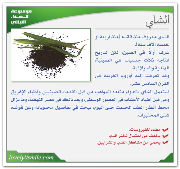 - شراب الشاي هو الأكثر انتشاراً وشعبية على وجه الأرض. يعتبر ثاني أهم مشروب بعد الماء. وصفه القدماء لعلاج الرشح، الربو، آلام الرأس، أمراض القلب والشرايين وأمراض كثيرة أخرى.