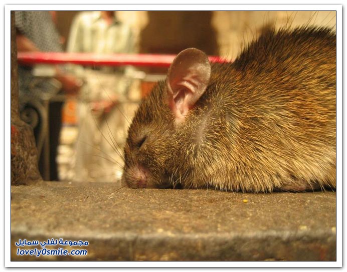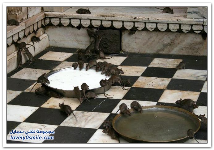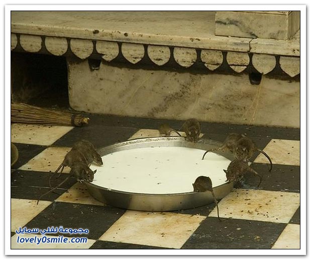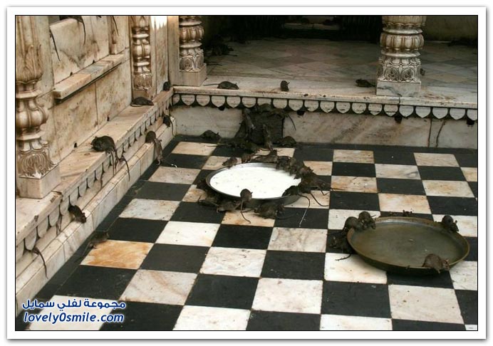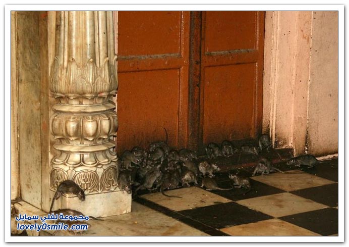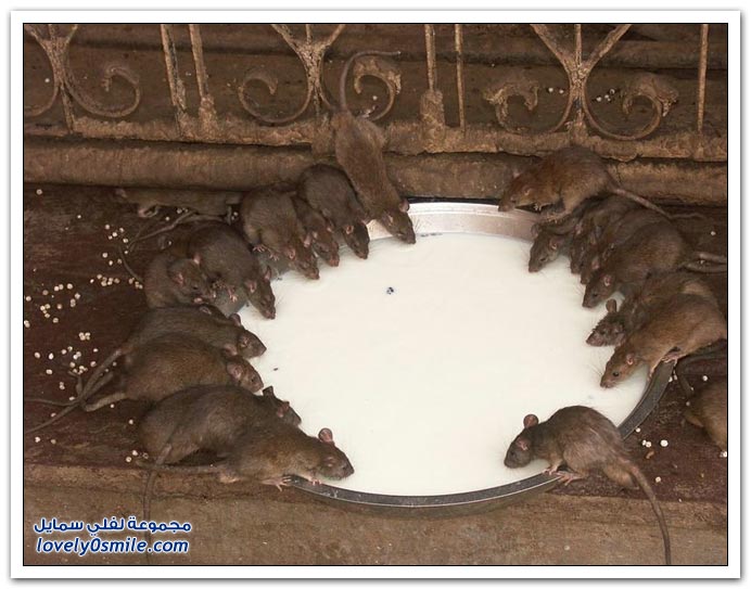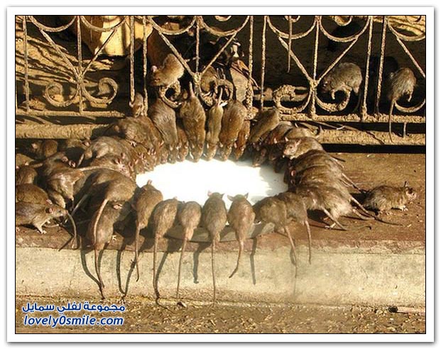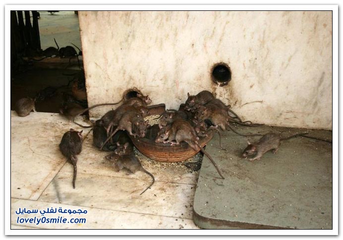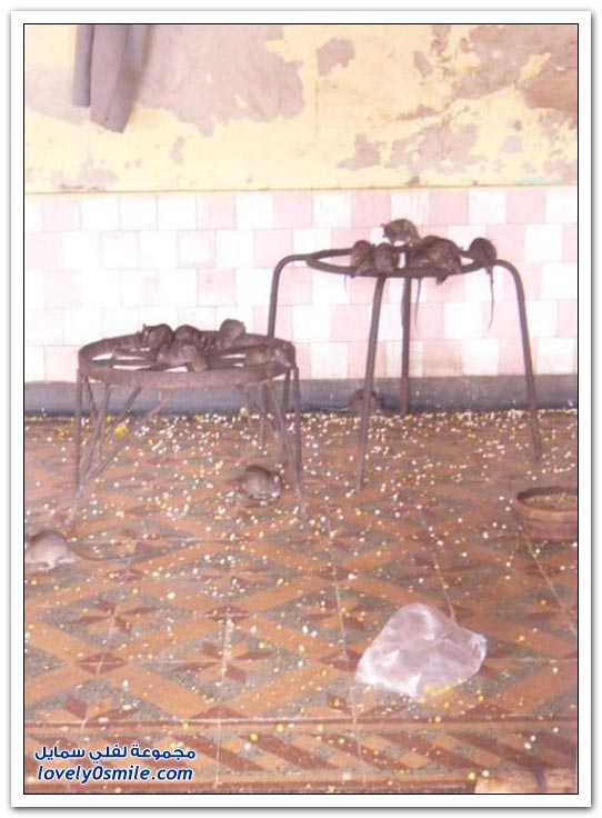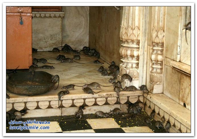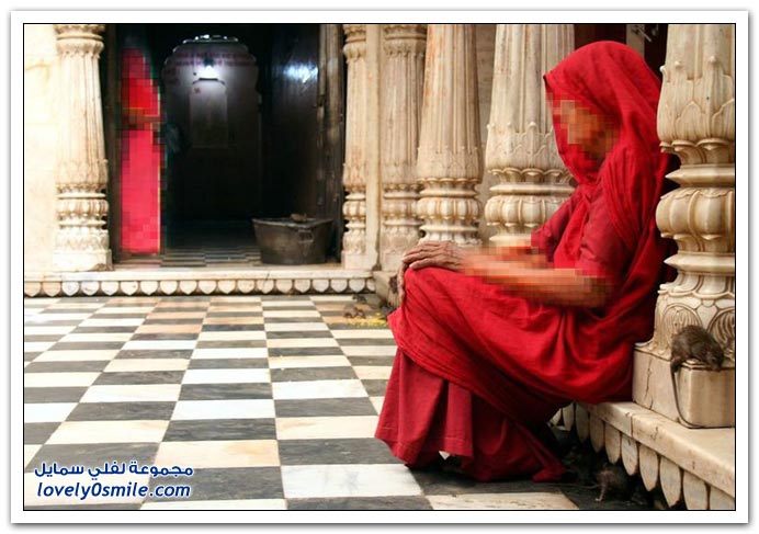 كان من الأصح أن يكون عنوان الصور "قصر الفئران" وليس "فئران القصر" ففي الهند، بلد العجائب والجياع، طائفة تعبد الفئران، ويقدم أفراد الطائفة الفئران على أنفسهم في المأكل والمشرب ومما لا تراه في هذه الصور أن الأماكن المكشوفة في هذا المعبد القصر مسقوفة يشيكات حديدية لمنع الطيور الجارحة من اصطياد الآلهة !!! ولكنك ترى بوضوح أدلة هذا التقديس في التماثيل والصور المنحوتة بالجدران .. ولاشك أنها ديانة تساعد على نشر الطاعون أيضا.