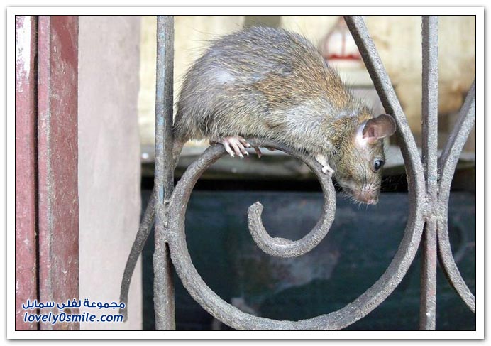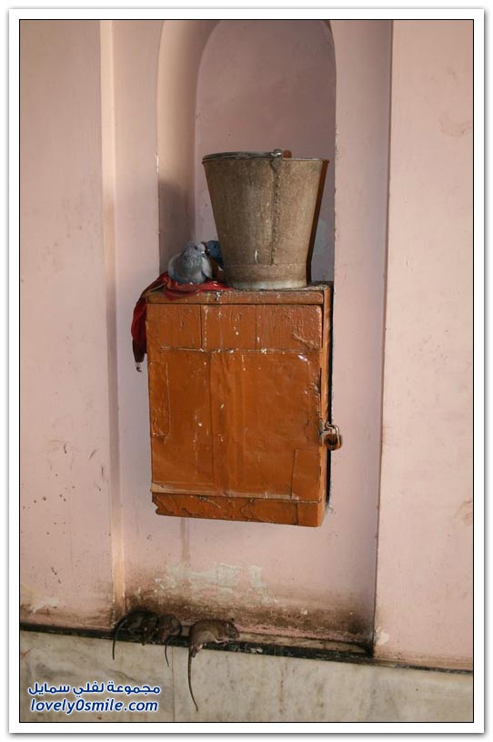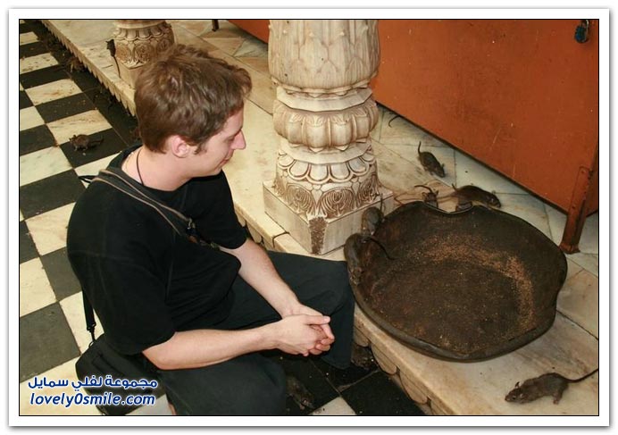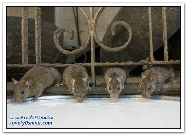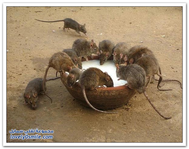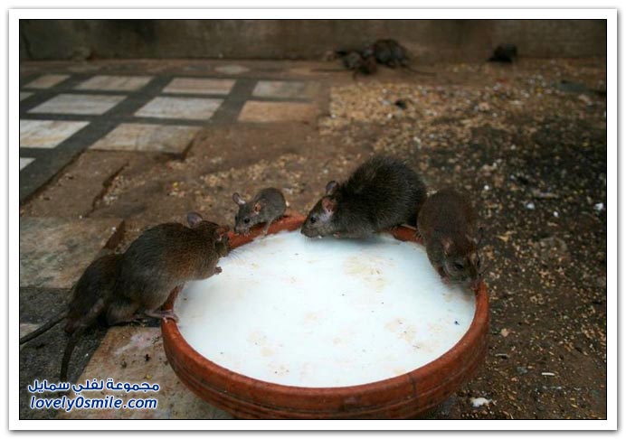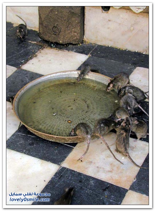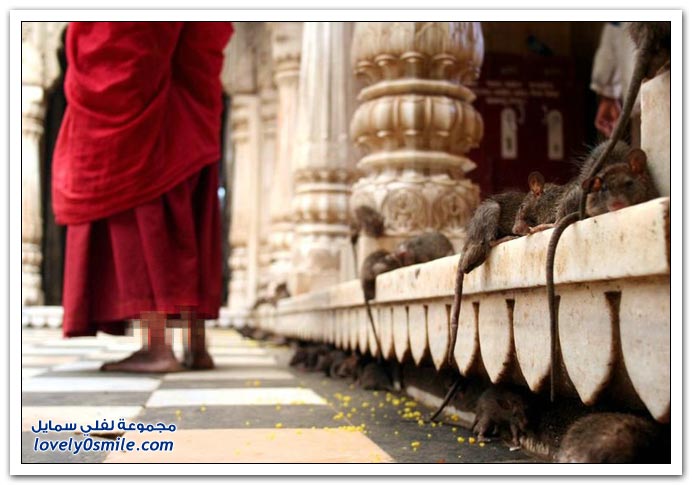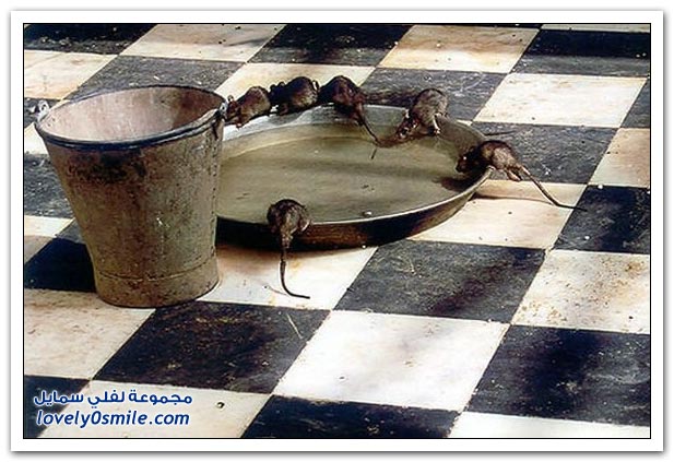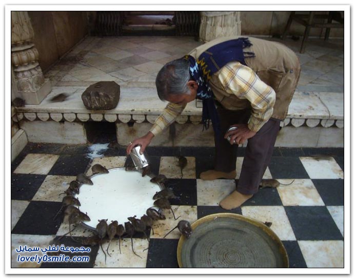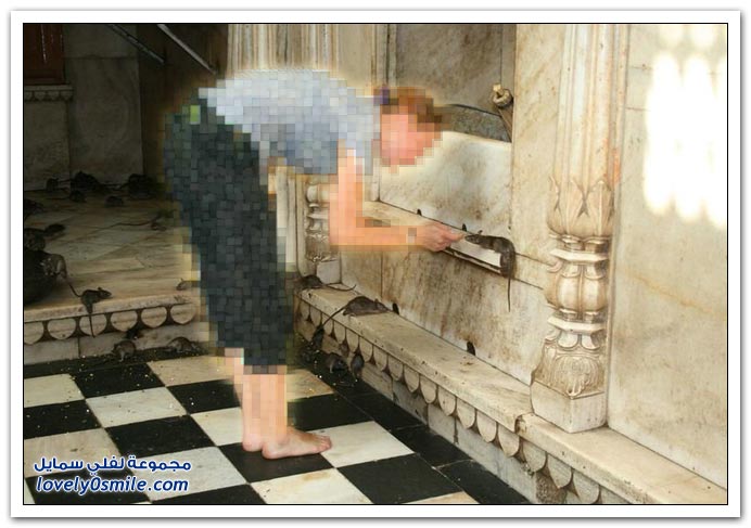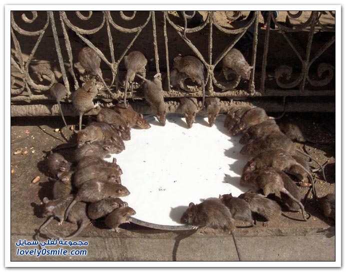 كان من الأصح أن يكون عنوان الصور "قصر الفئران" وليس "فئران القصر" ففي الهند، بلد العجائب والجياع، طائفة تعبد الفئران، ويقدم أفراد الطائفة الفئران على أنفسهم في المأكل والمشرب ومما لا تراه في هذه الصور أن الأماكن المكشوفة في هذا المعبد القصر مسقوفة يشيكات حديدية لمنع الطيور الجارحة من اصطياد الآلهة !!! ولكنك ترى بوضوح أدلة هذا التقديس في التماثيل والصور المنحوتة بالجدران .. ولاشك أنها ديانة تساعد على نشر الطاعون أيضا.