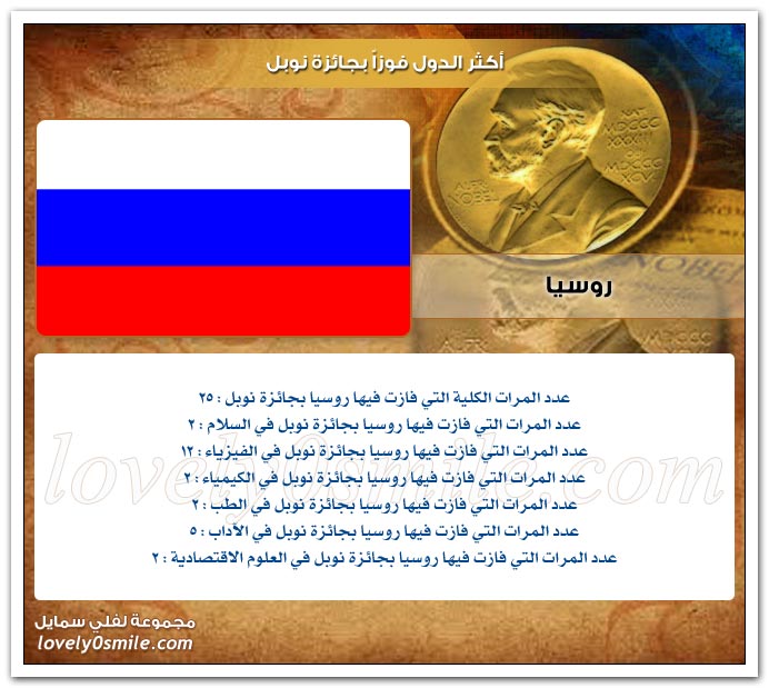 لكي تكمل الفائدة يرجي عمل ملخص يوضح الترتيب التنازلي لعدد مرات فوز الدول بالجائزة .. حتي تظهر اسماء دول عربية مثل مصر والسعودية واليمن .. جزى الله القائمين علي هذه المجموعة خيرا لما يبذلونه من اعمال مفيده وهادفة.