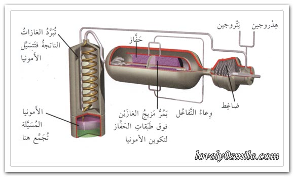 - في هذه الطريقة يفاعل غاز النتروجين (ن2) الذي يؤلف أربعة أخماس الهواء كيماويا مع غاز الهدروجين (هـ2) لصنع الأمونيا (ن هـ3) التي هي أحد المقومات الأساسية في الصناعات الكيميائية.