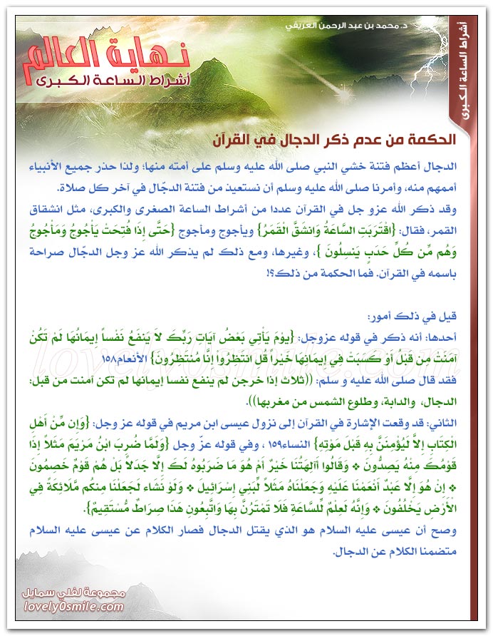 الحكمة من عدم ذكر الدجال في القرآن + الأحاديث الدالة على أن خروج الدجال من أشراط الساعة