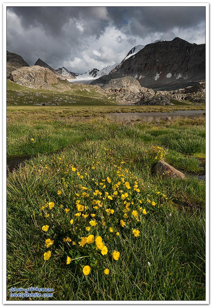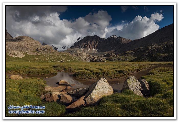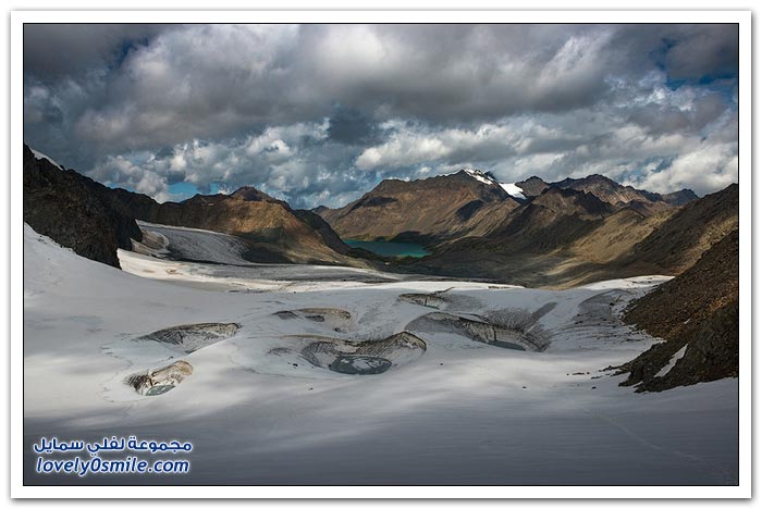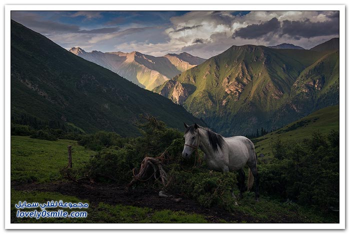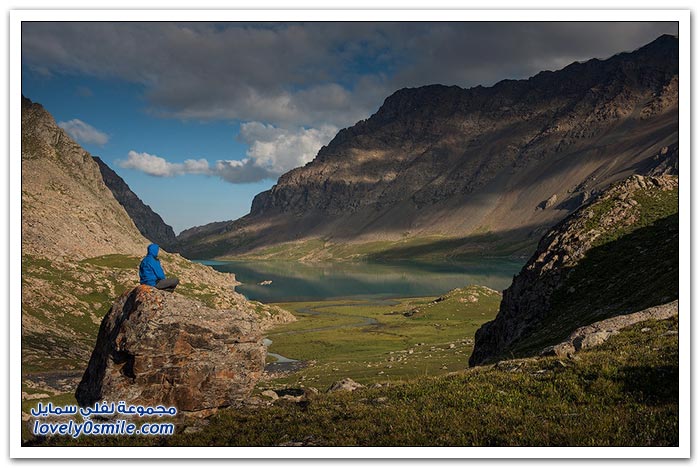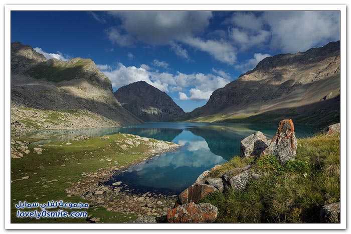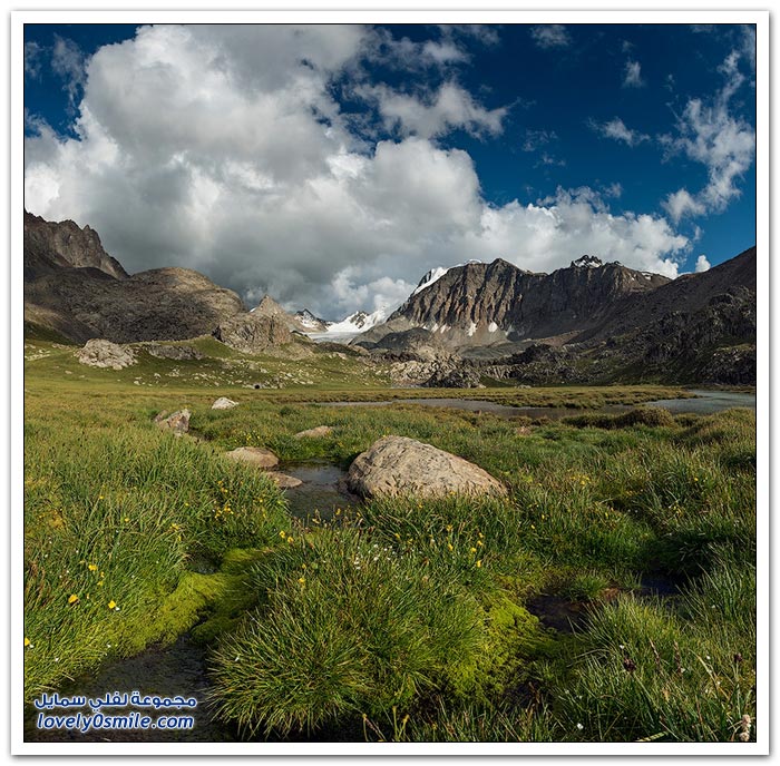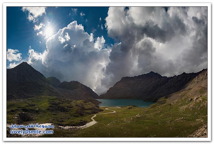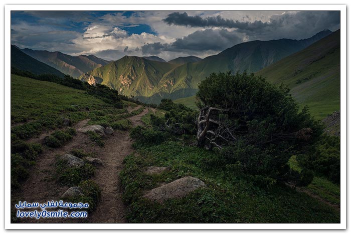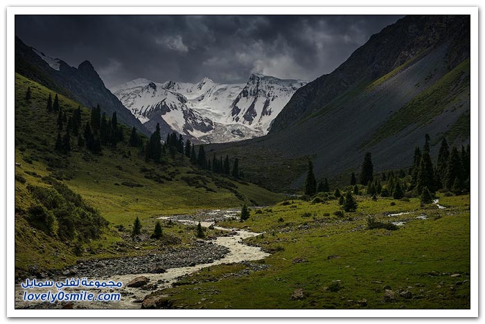 - أرض قرغيزيا جبلية في مجملها. تتكون من هضبة عالية تضم في شمالها سلاسل جبلية تمثل القسم الغربي من جبال تيان شان. وتضم في الجنوب جبال ألاس (ألايسكي) والتي ترتفع إلى أكثر من سبعة آلاف متر (7134) والقسم الأوسط من قرغيزيا سهل ينفتح في الغرب على سهول وسط آسيا. ويضم هذا القسم مجموعة من الوديان النهرية. مثل وادي نارين ووادي نار. وتكون هذه الوديان مجموعة من البحيرات. ويشكل هذا النظام وادي فرغانة، صاحب الشهرة التاريخية في الفتوح الإسلامية لهذه البلاد. والمجموعة المائية تلك جزء من الروافد العليا لنهر سيحون (سرداريا). وهناك بحيرة كبيرة في الشمال اسمها "إيصيق قول".