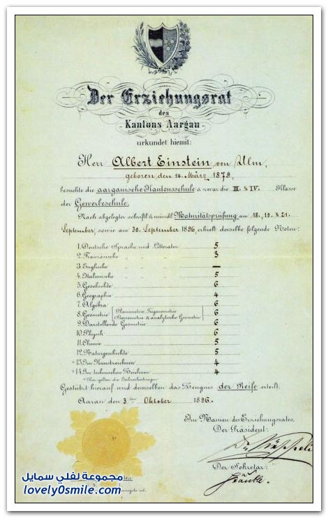 شهادة الثانوية العامة الخاصة بالعالم ألبرت آينشتاين عندما كان في السابعة عشر من عمره تظهر علاماته النهائية.
