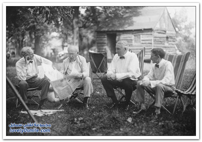 هنري فورد، توماس أديسون، وارن هاردينغ وهارفي صموئيل فيرستون يتجاذبون الحديث مع بعضهم