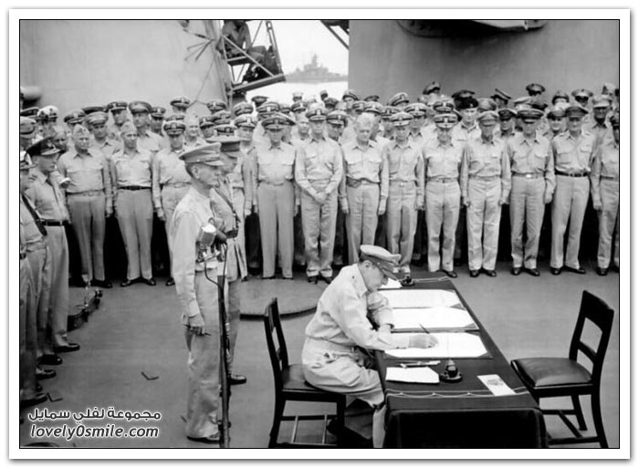 الجنرال دوغلاس ماكارثر يوقع على صك استسلام اليابان على ظهر السفينة يو اس اس ميسوري، عام 1945