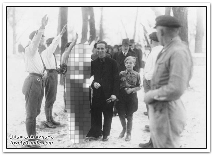 جوزيف غوبليز (وزير الدعاية النازي) في يوم زفافه، ويظهر هتلر خلفه في الصورة يرتدي معطفا وقبعة.