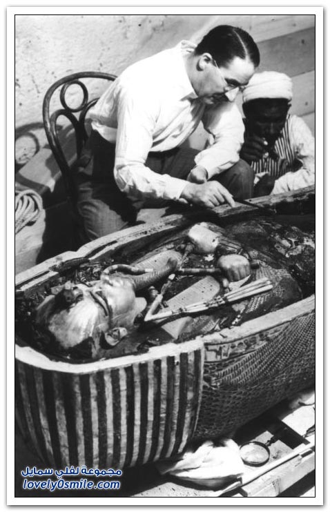 عالم الآثار الإنجليزي هوارد كارتر يتفحص تابوت الملك توت غنخ أمون