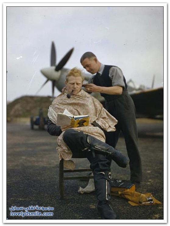 طيار من سلاح الجو الملكي البريطاني يتم حلاقة شعره بينما يقرأ في كتاب أثناء استراحة بين المهمات