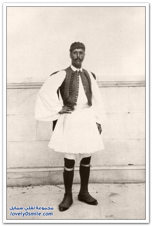 سبيروس لويس في زي اليونان التقلديدي، وهو أو فائز بسباق الماراثون خلال أول ألعاب أولمبية أقيمت في اليونان عام 1896