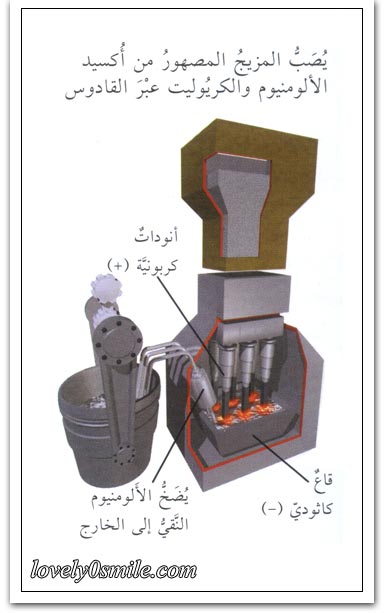 - يحضر الألومنيوم النقي في قدور كبيرة بطريقة الكهرلة (التحلل الكهربائي) وذلك بإمرار تيار كهربائي قوي عبر مزيج من الكريوليت (ألومينات الصوديوم الفلوريدية) والبوكسيت (هدروكسيد الألومنيوم).