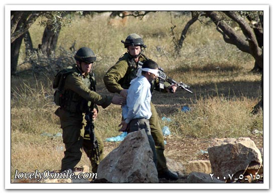 جنود صهاينة يعتقلون أحد عناصر حركة الجهاد أثناء عملية توغل في مدينة جنين بالضفة الغربية.