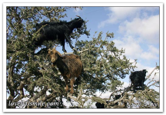 حيوان الماعز يتسلق الأشجار في إحدى المناطق الصحراوية بالمغرب بحثاً عن الطعام.