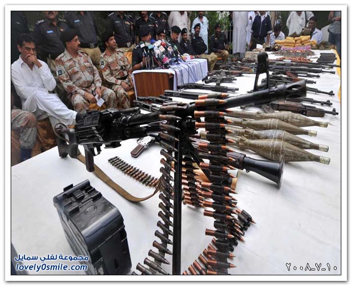 الشرطة الباكستانية تعرض كميات كبيرة من الأسلحة المصادرة في مدينة كراتشي.