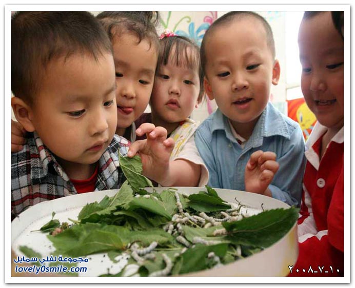 أطفال صينيون يتحلقون حول عدد من دود القز في محافظة شانكسي.