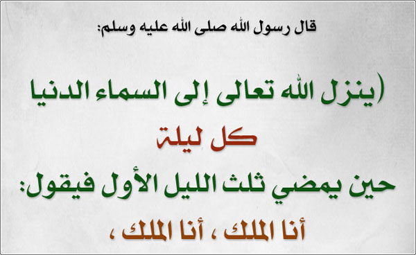 ينزل الله تعالى إلى السماء الدنيا كل ليلة حين يمضي