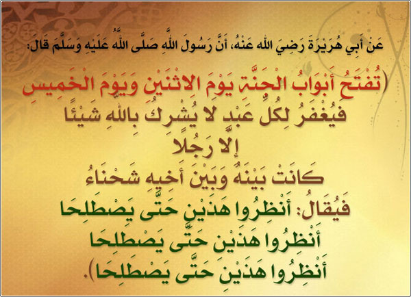 تفتح أبواب الجنة يوم الاثنين ويوم الخميس فيغفر لكل