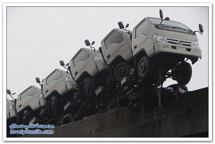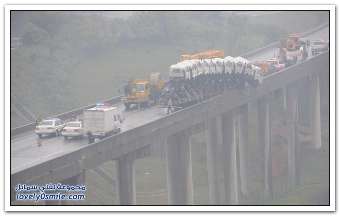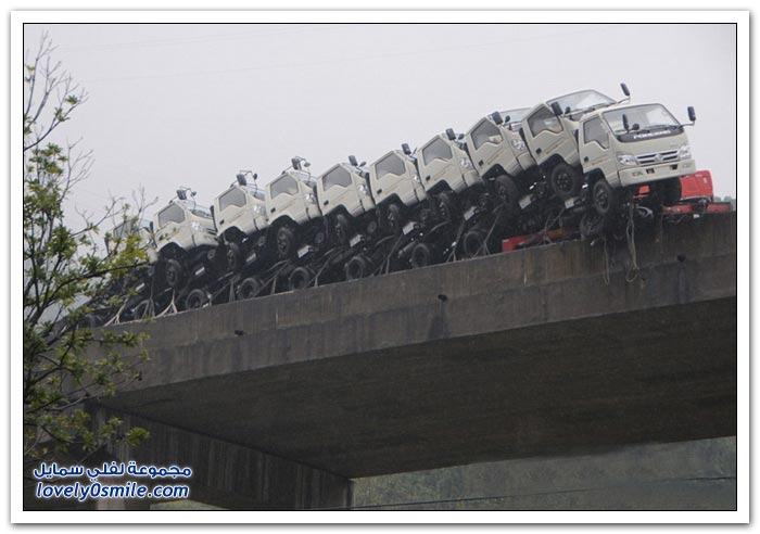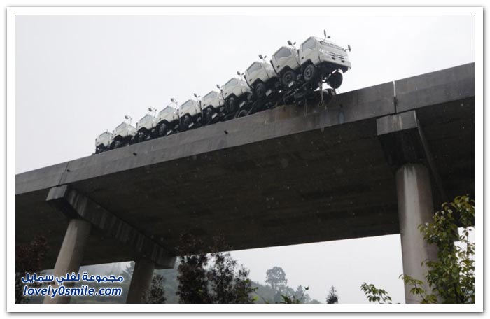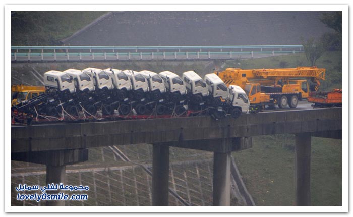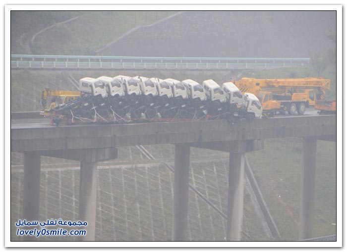 شاحنات على وشك السقوط من على جسر في الصين