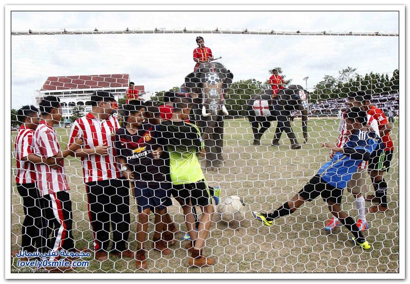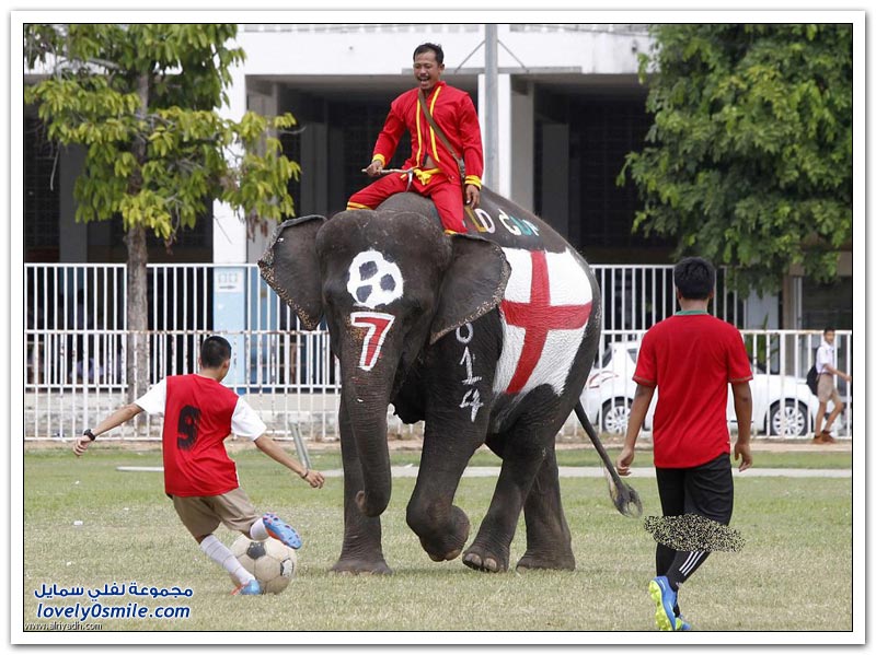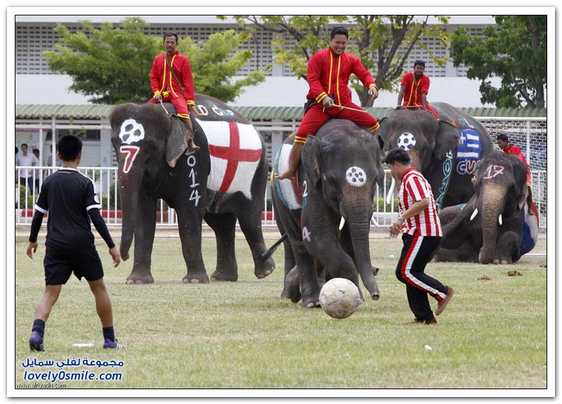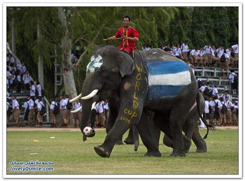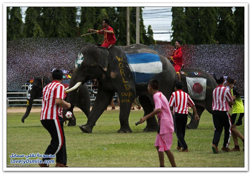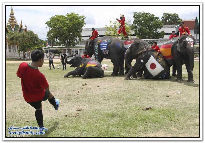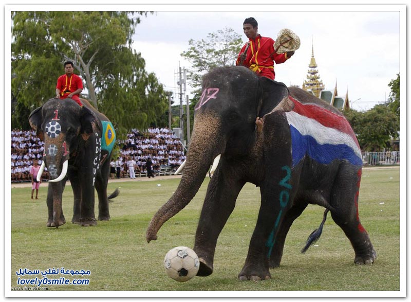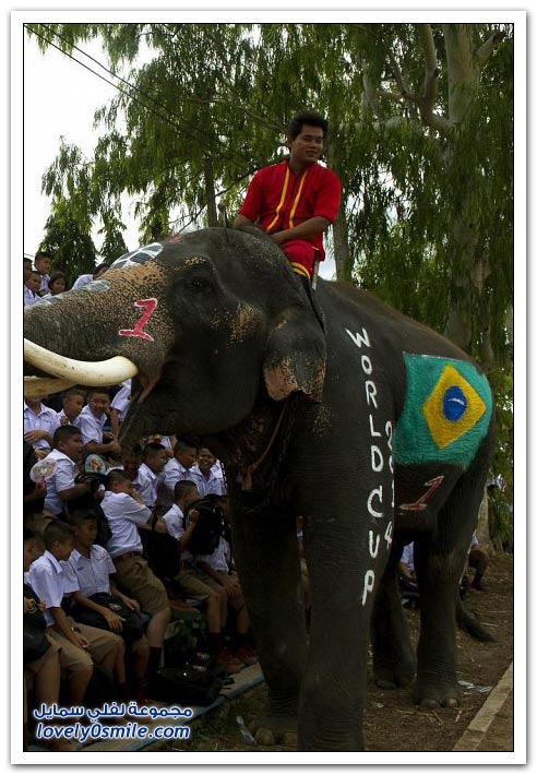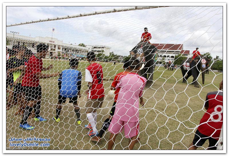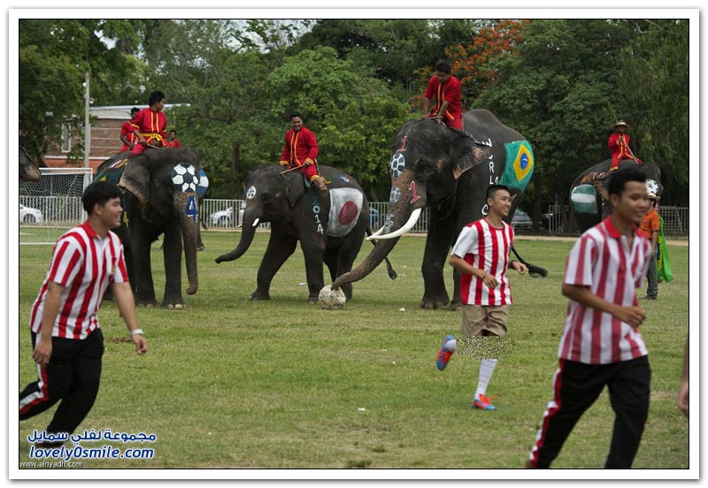 أقيمت مباراة بين الفيلة والطلاب التايلنديين ضمن حملة لتشجيع كأس العالم في إقليم أيوتايا