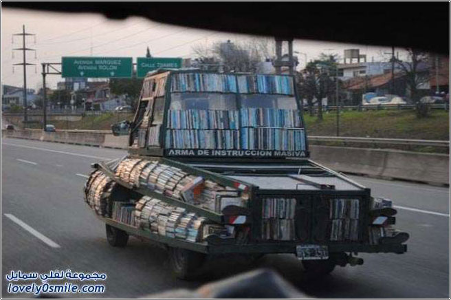 بائع الكتب المتجول في سيارة على شكل دبابة