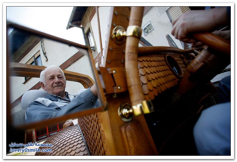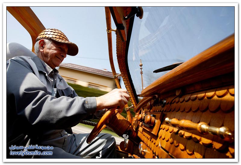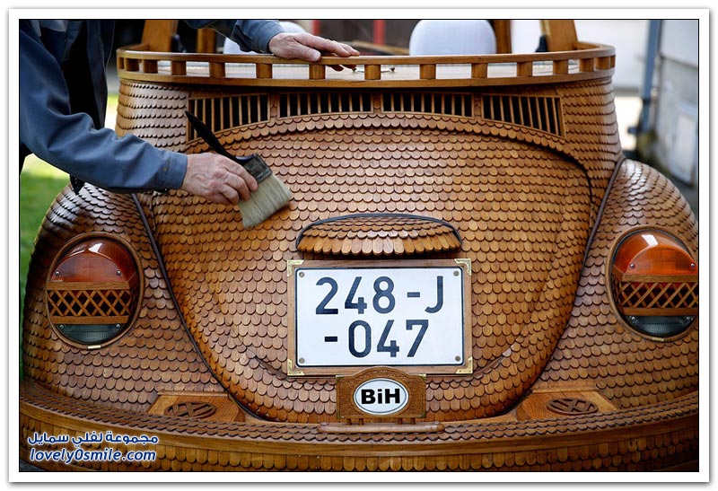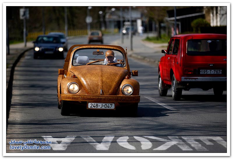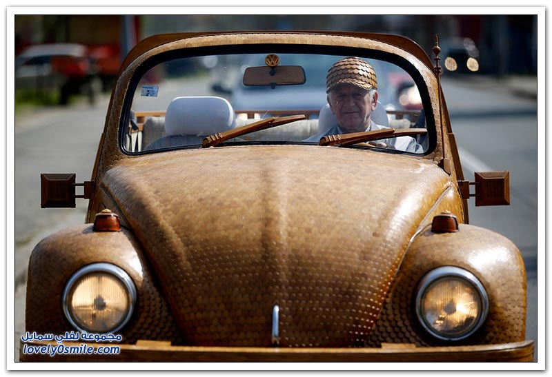 المتقاعد البوسني مومير بوجيك يقود سيارة فولكس فاجن بيتل "الخنفساء" المصنوعة من الخشب بالقرب من مدينة بنيالوكا في البوسنة والهرسك ، وبوجيك قام بصنع المركبة عن طريق استخدام 50،000 قطعة من خشب السنديان والتي استغرق صنعها سنتان .