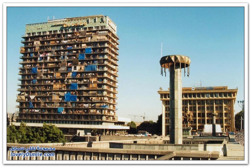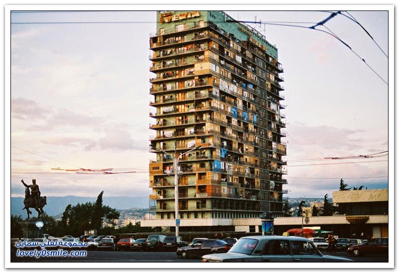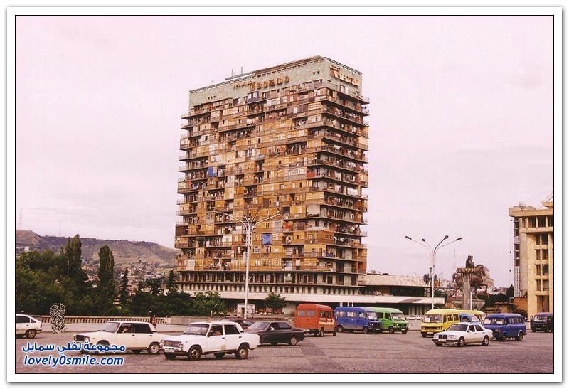 - ففى بداية التسعينات أى بعد وقت قصير من انهيار وتفكك الاتحاد السوفياتي اندلعت الحرب الأهلية في جورجيا،وامتلأت العاصمة تبليسي باللاجئين الجورجيين الهاربين من أراضي النزاع في "أبخازيا" غرب جورجيا، حيث توجه إلى المدينة أكثر من 200,000 لاجئ، مما دفع الحكومة إلى إعطاء بعض المباني الكبيرة في تبليسي، بما في ذلك هذا الفندق مكأوي لهؤلاء النازحين، والذي كان يؤوي أكثر من 1000 نازح حتى أصبح في مشهد يرثىله، حيث كسرت النوافذ وخشب الشرفات والأبواب وتم تدمير جميع معالمه.
